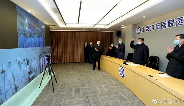 自今年1月12日起,首都醫科大學附屬北京地壇醫院開始承擔新冠肺炎患者的救治、篩查、隔離工作,收治了北京市第一例確診病例。習近平來到地壇醫院門診樓一層運行監控中心,通過監控畫面察看患者住院診療情況,并視頻連線正在病房值班的醫務人員,鼓勵他們繼續完善診療方案,繼續全力以赴救治患者,努力提高收治率和治愈率、降低感染率和病亡率,并叮囑他們做好自我防護。