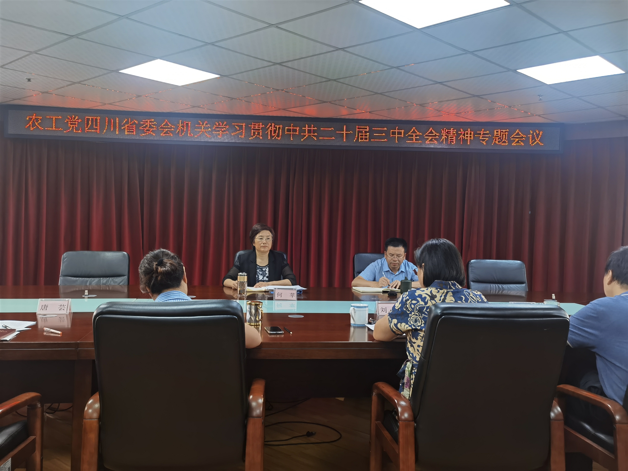 7月22日,農(nóng)工黨四川省委會(huì)機(jī)關(guān)召開專題會(huì)議,學(xué)習(xí)貫徹中共二十屆三中全會(huì)精神。省委會(huì)專職副主委、省政協(xié)副秘書長(zhǎng)何蘋主持會(huì)議并講話。