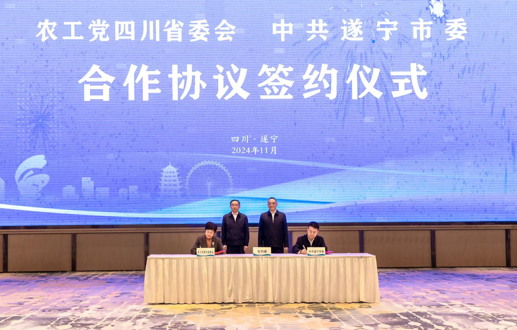 2024年11月25日,農(nóng)工黨四川省委會與中共遂寧市委合作協(xié)議簽約儀式在遂寧舉行。四川省人大常委會副主任、農(nóng)工黨省委會主委何延政,遂寧市委書記嚴(yán)衛(wèi)東出席活動并致辭。農(nóng)工黨四川省委會專職副主委、省政協(xié)副秘書長何蘋,遂寧市委副書記、遂潼園區(qū)黨委書記景臨簽署了合作協(xié)議,雙方將在參政議政、社會服務(wù)、組織建設(shè)、農(nóng)工黨示范基地建設(shè)、人才交流培養(yǎng)等領(lǐng)域開展合作。